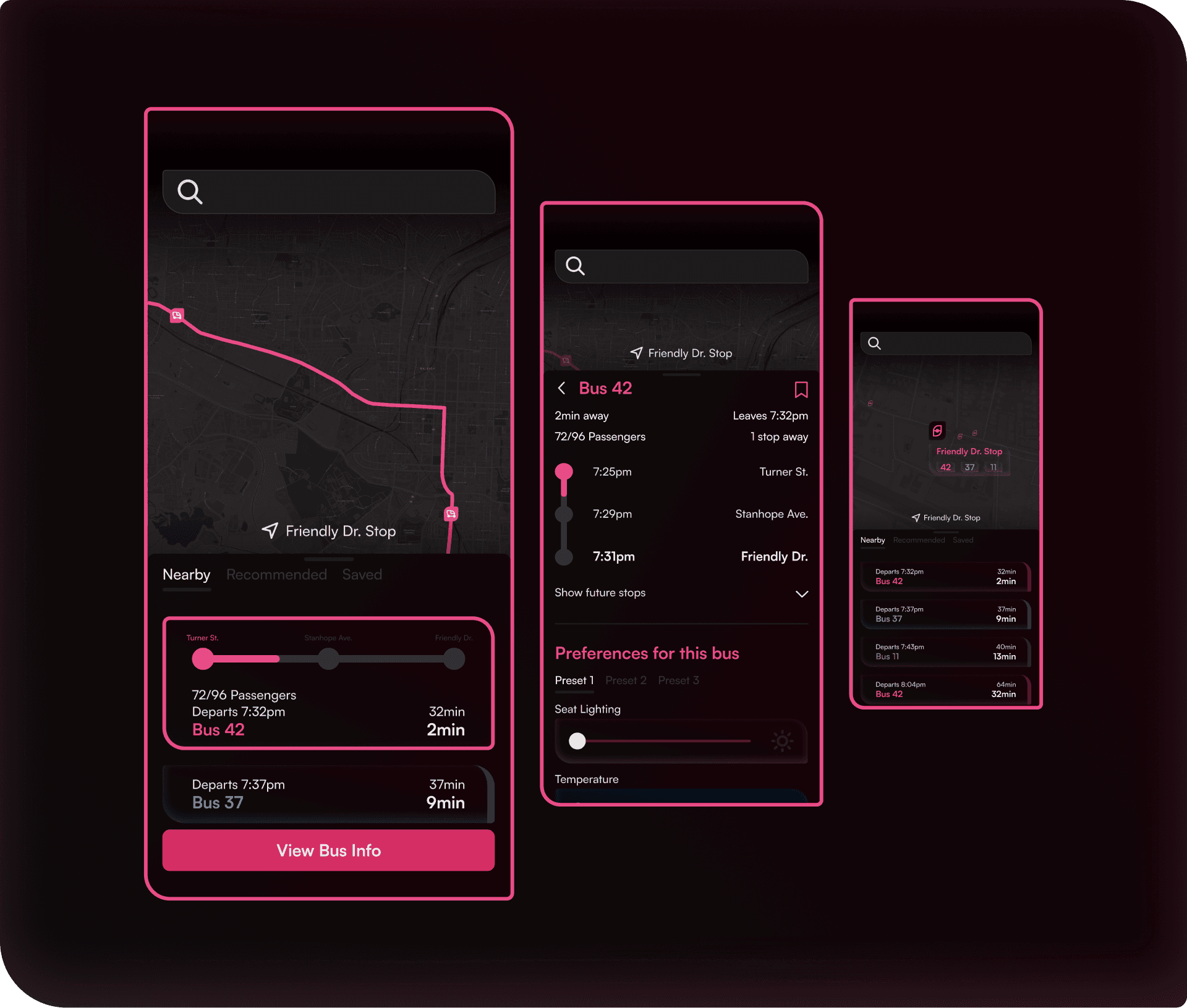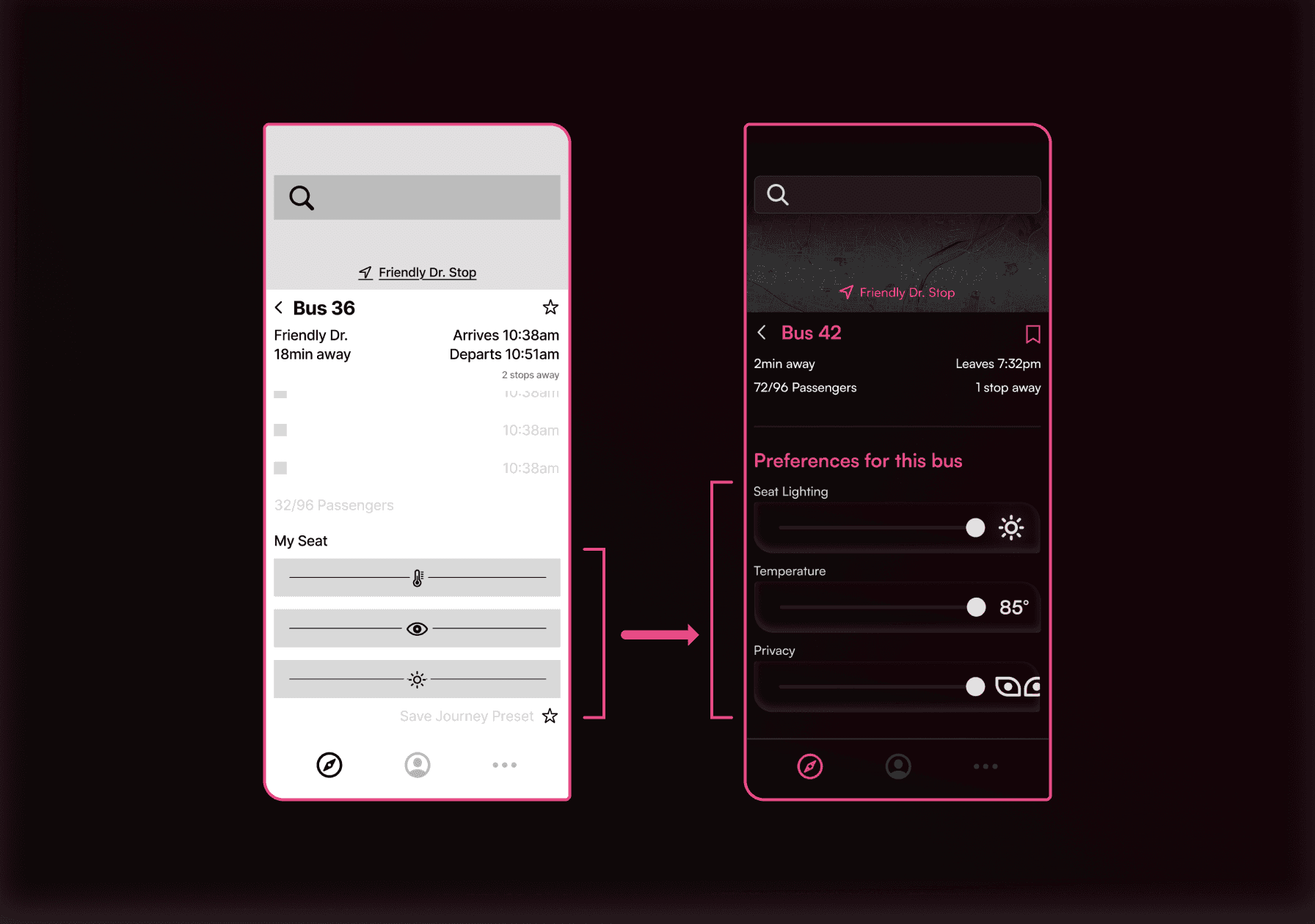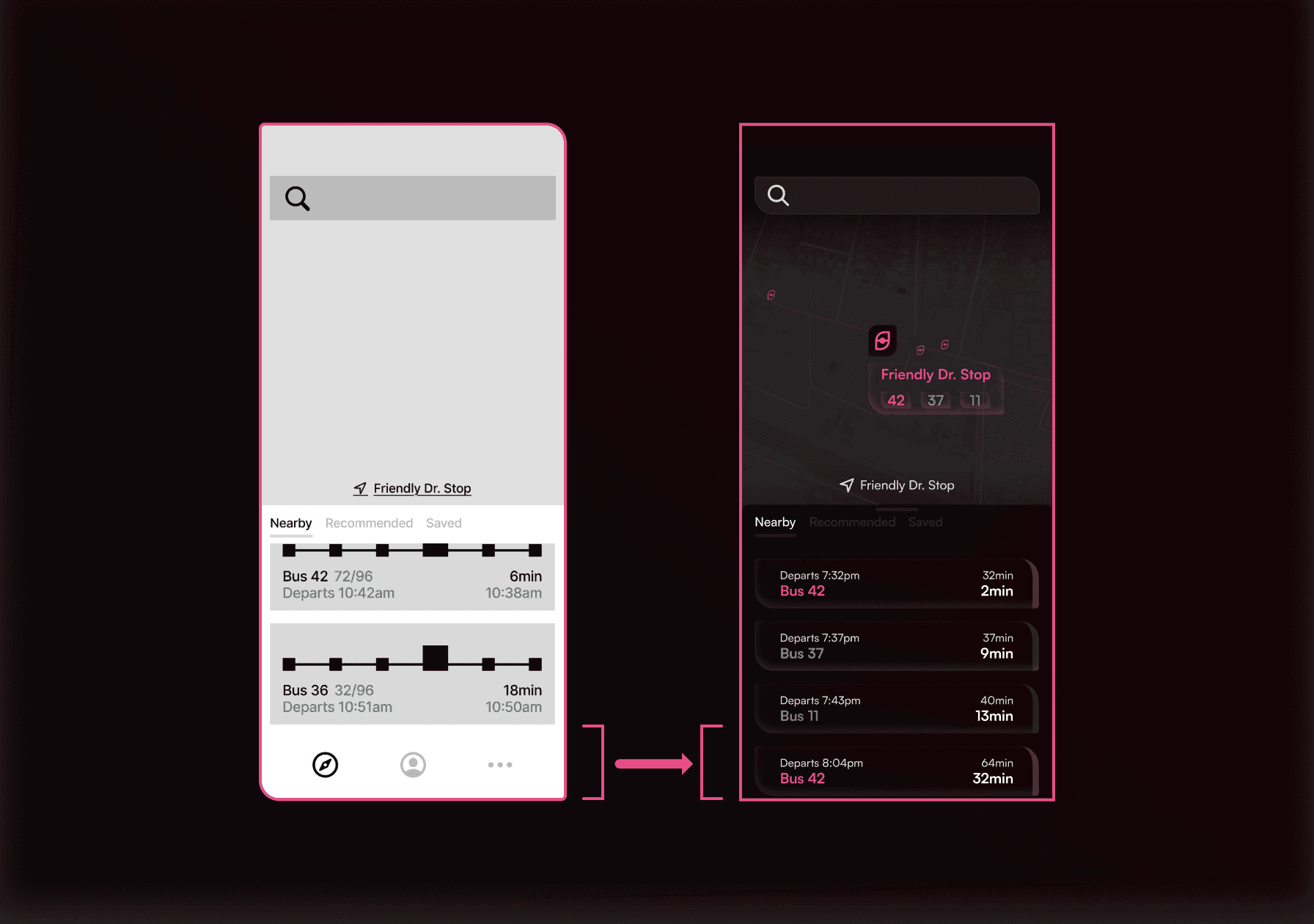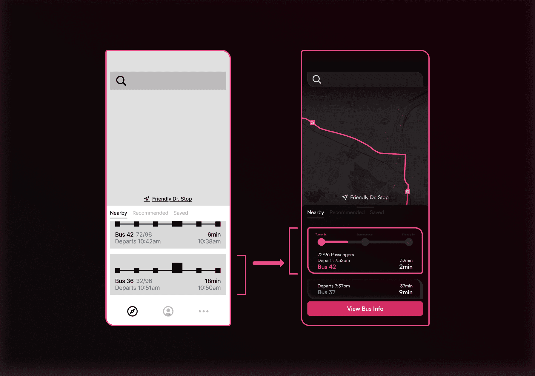 The previous interaction pattern sent the user straight into the bus specific screen, without indications or previews of that stop. The new interaction allows users to preview the bus route beforehand.